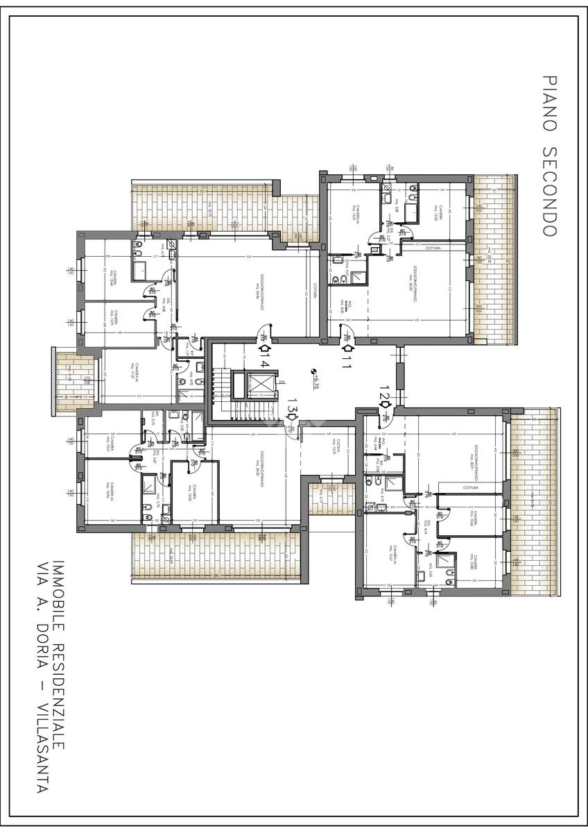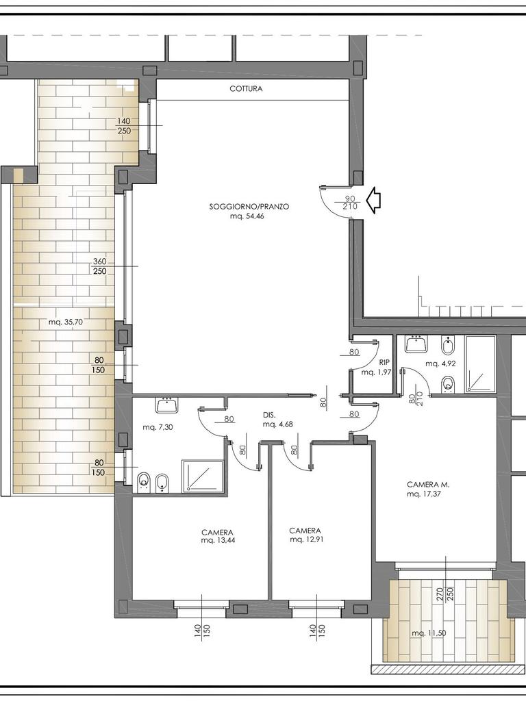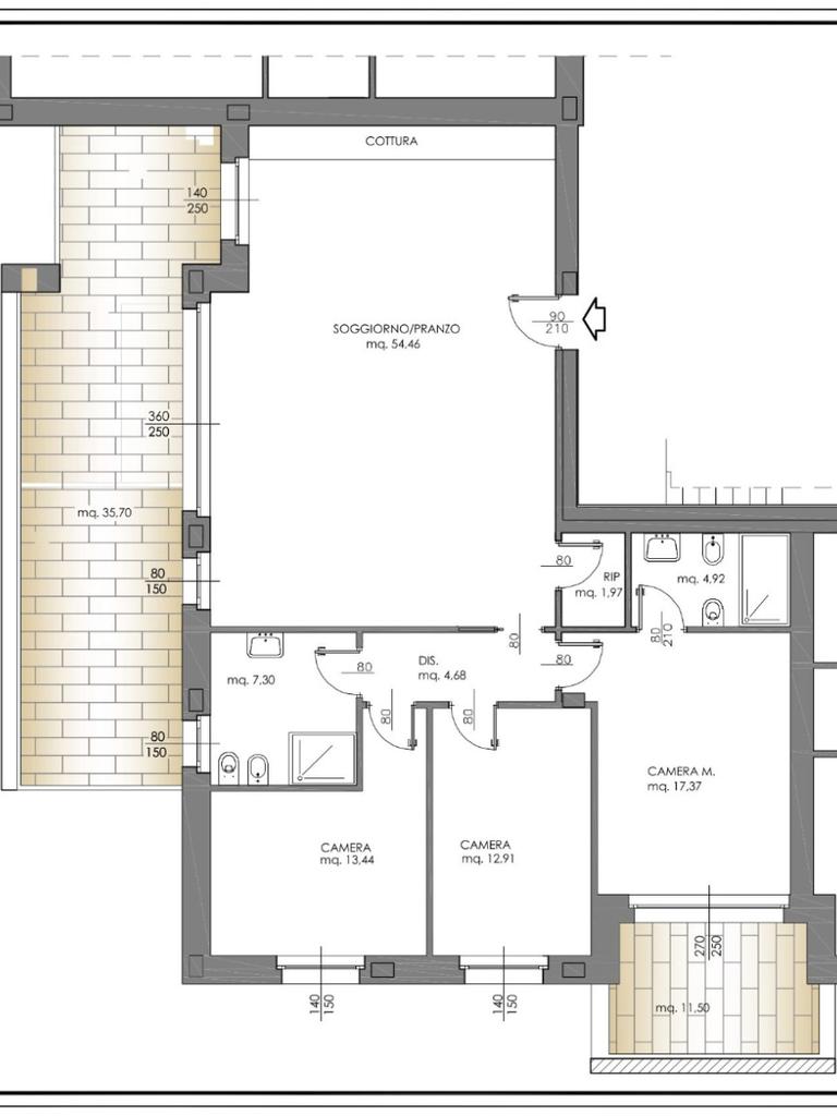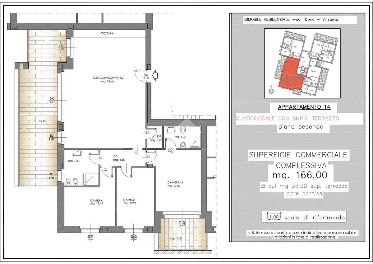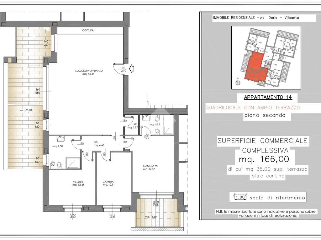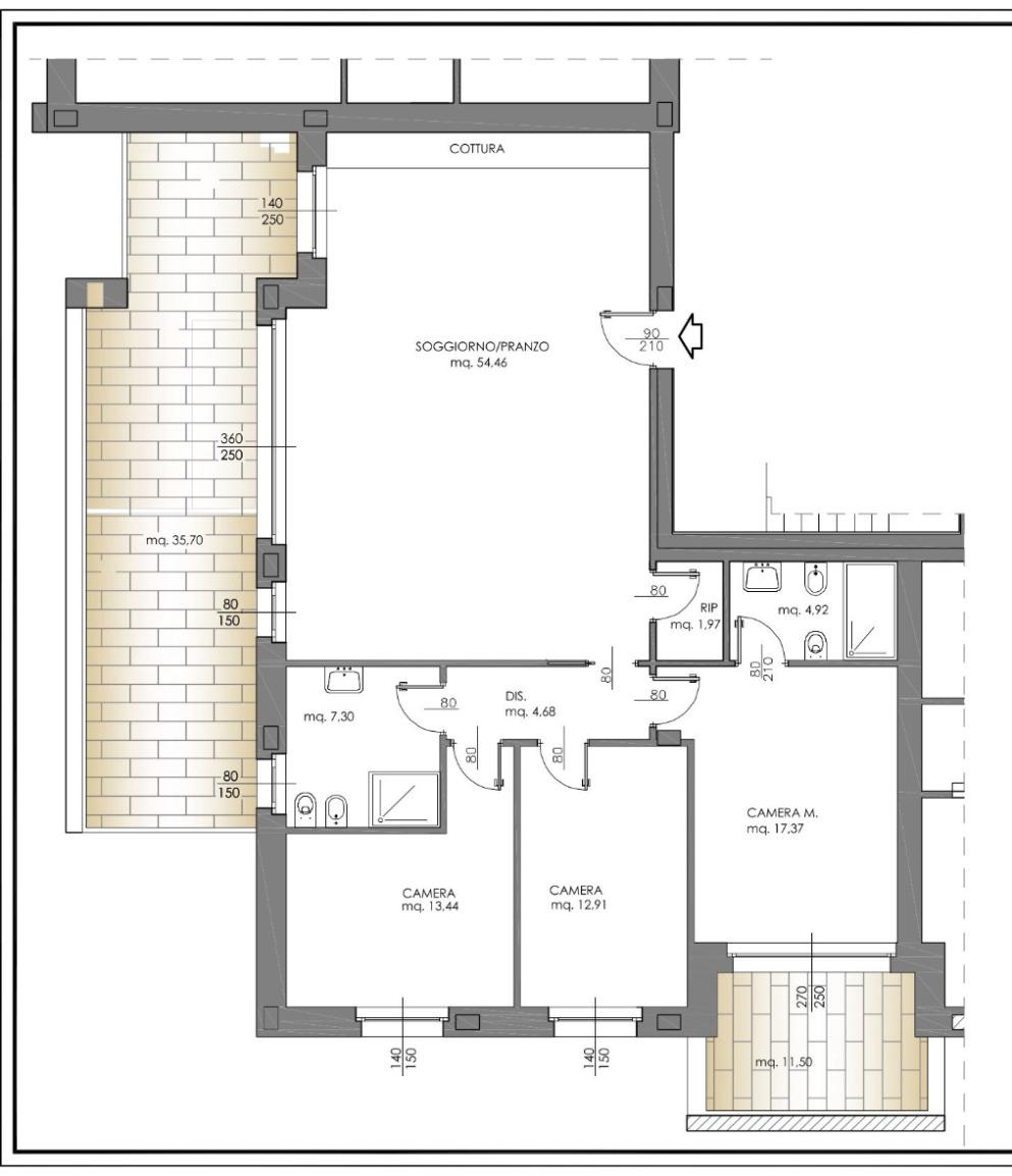 La soluzione, di 166 mq commerciali (140 mq calpestabili), è composta da ingresso su ampia e luminosa zona living con accesso al terrazzo di 35 mq, cucina a vista, ripostiglio, due camere doppie, una camera matrimoniale con bagno privato en suite e un secondo bagno di servizio.