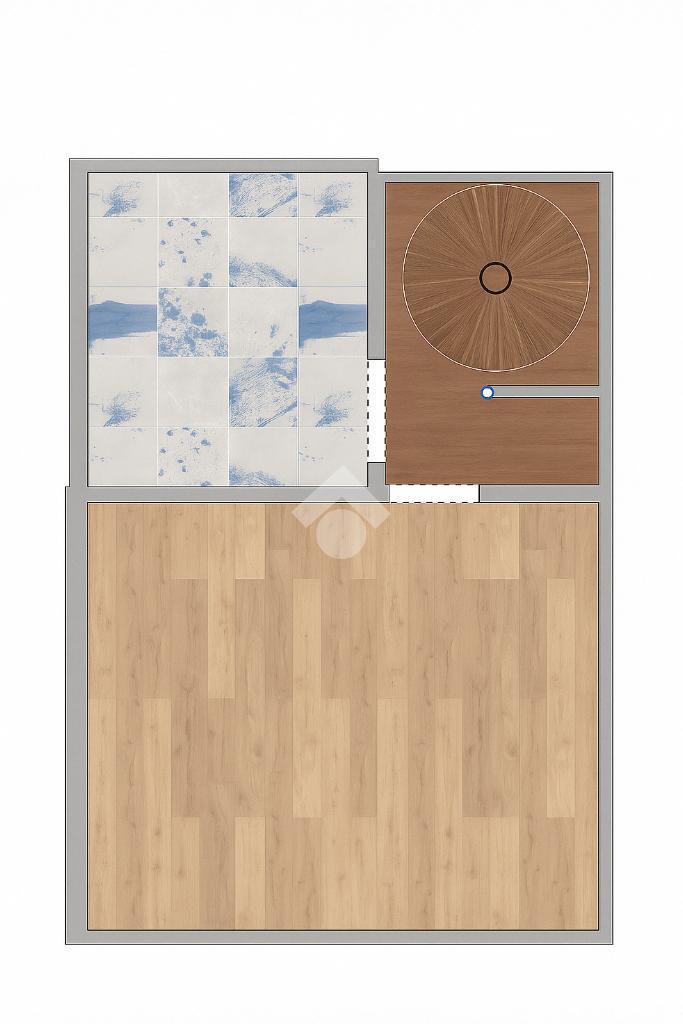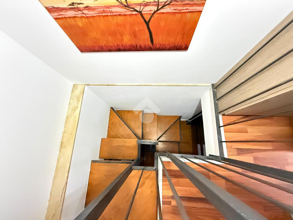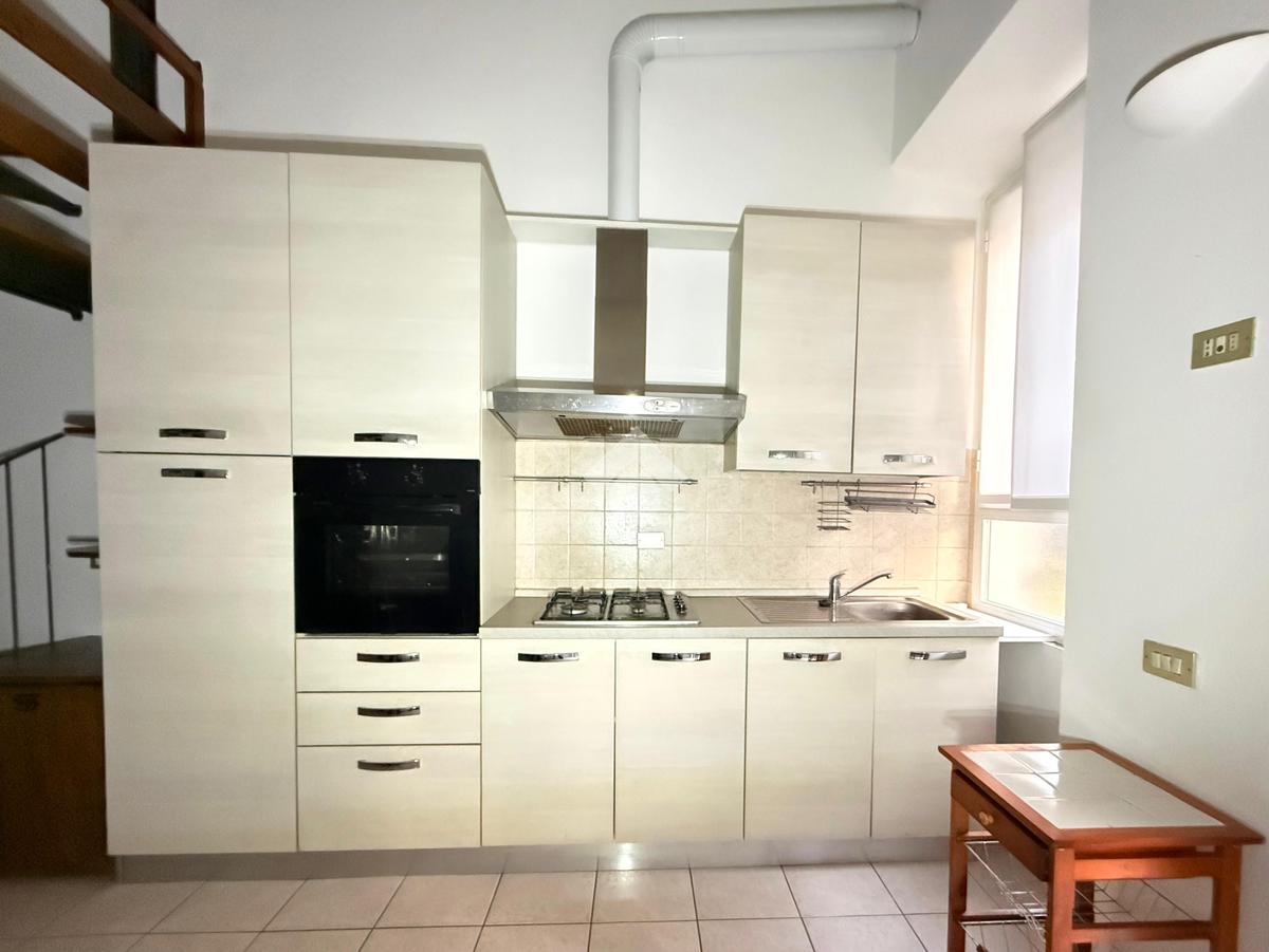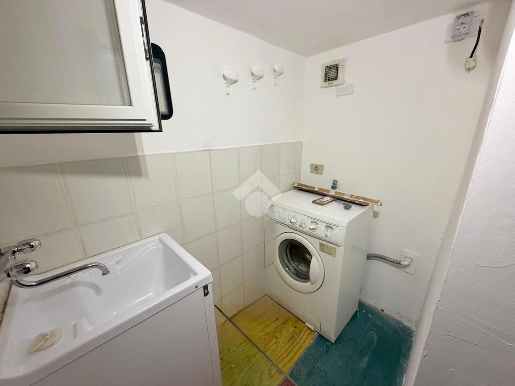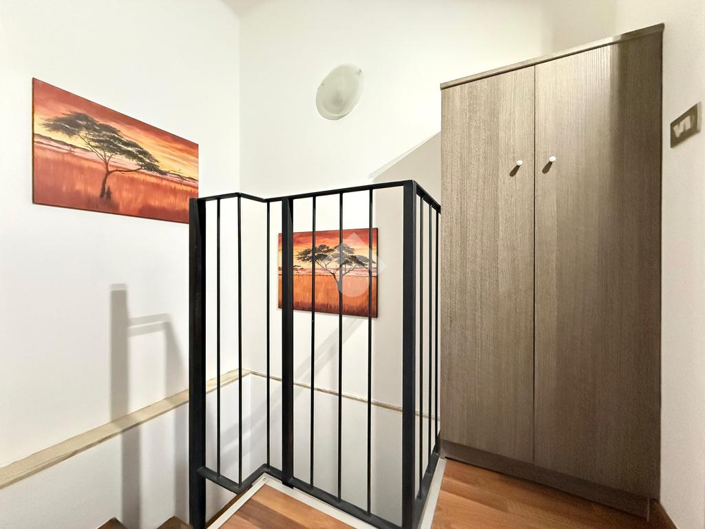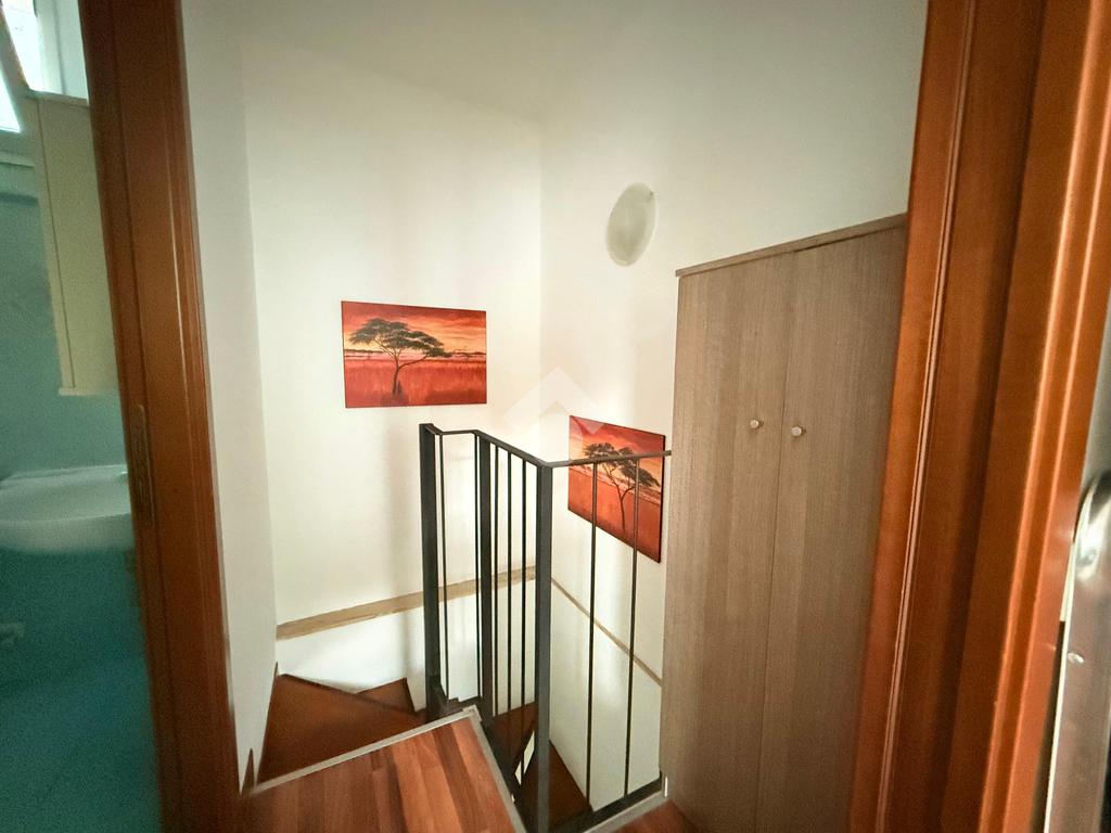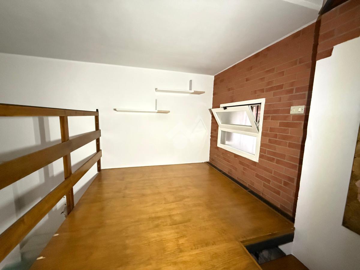 L’ingresso conduce alla zona giorno con cucina a vista e lavanderia. Al piano superiore si sviluppa la camera da letto, dotata di porta finestra che si affaccia sul ballatoio, e un bagno con box doccia.