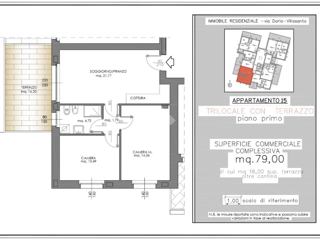 La soluzione, di 79 mq commerciali (67 mq calpestabili), è composta da ingresso sulla zona giorno, disimpegno, bagno, camera singola e camera matrimoniale.